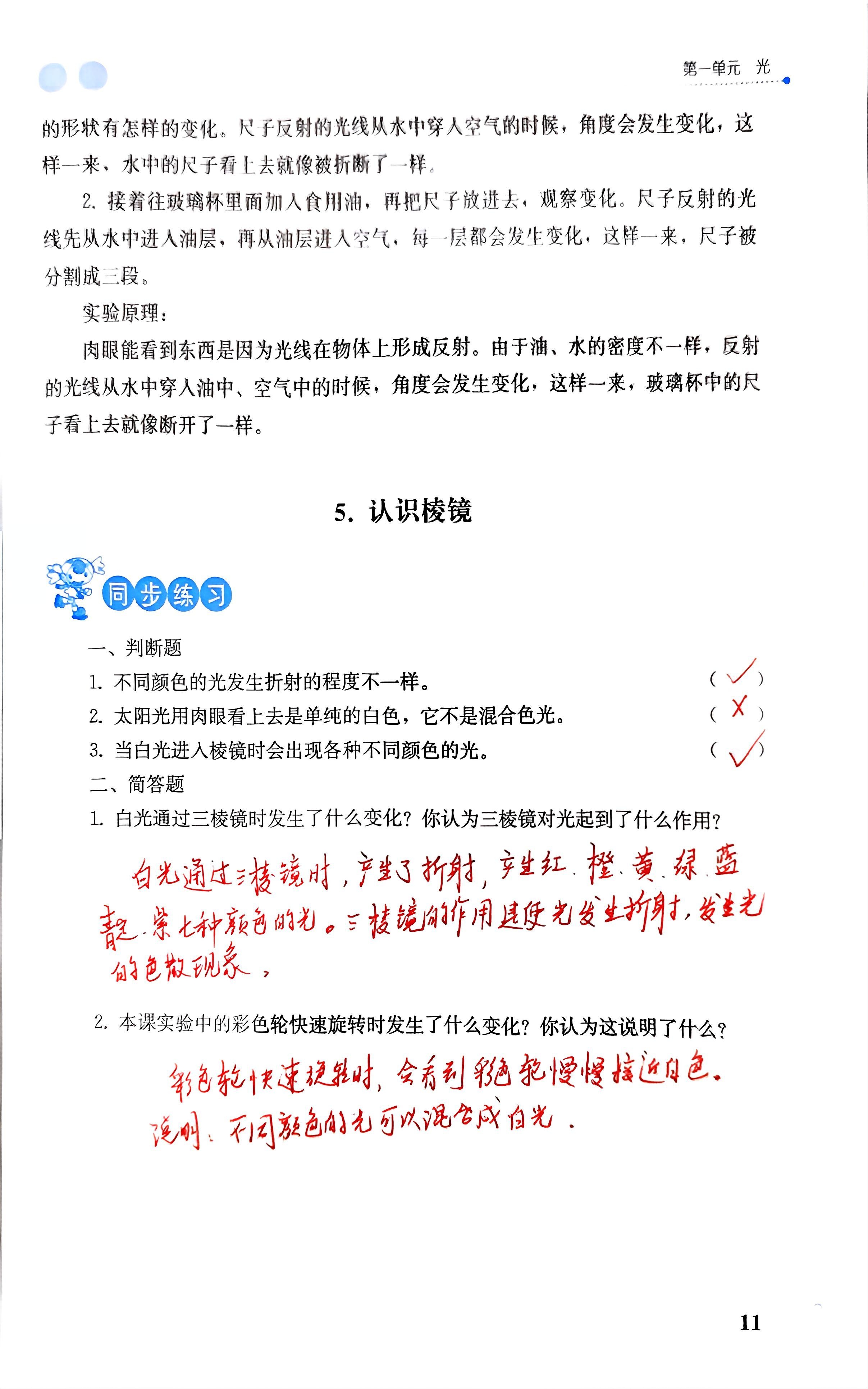 义务教育新课程导学案教科版五年级科学上册教辅答案(第一单元第五课认识棱镜)