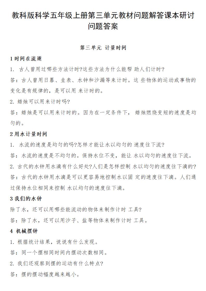 教科版科学五年级上册第三单元教材问题解答课本研讨问题答案,仅提供网盘下载,如介意,请不要下载。