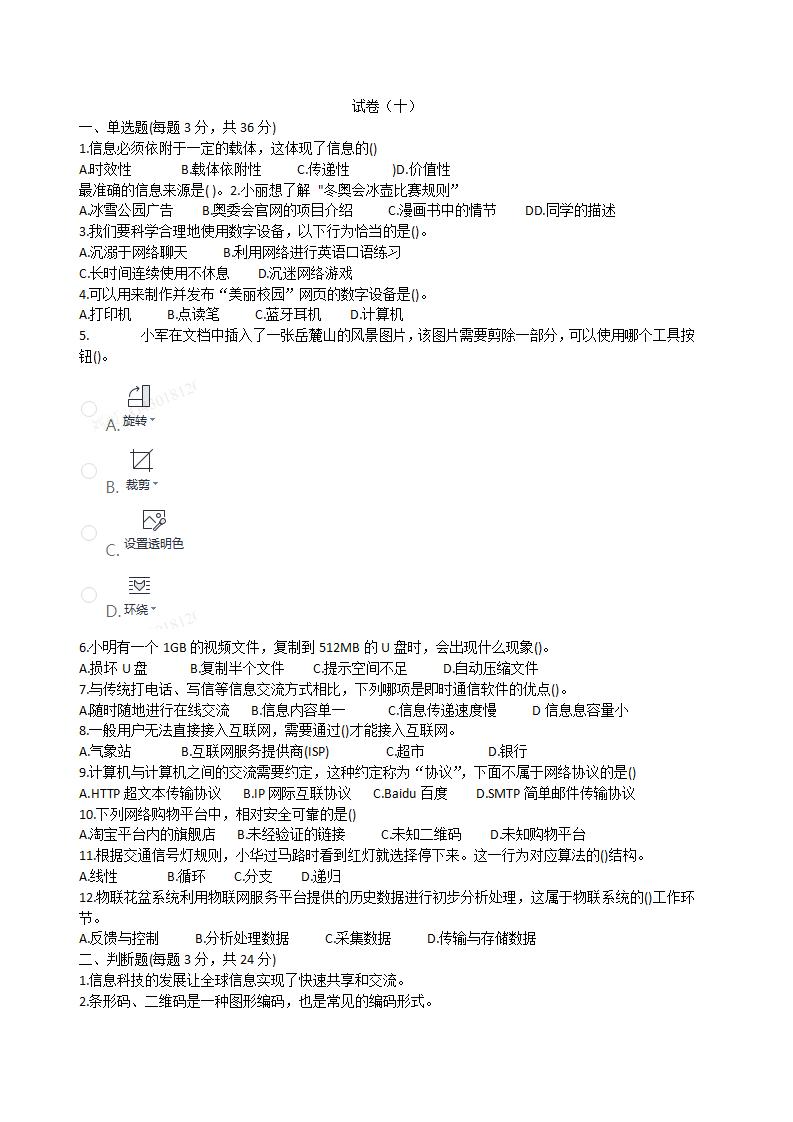 2025年信息科技中考练习试卷10,仅提供网盘下载,如介意,请不要下载。