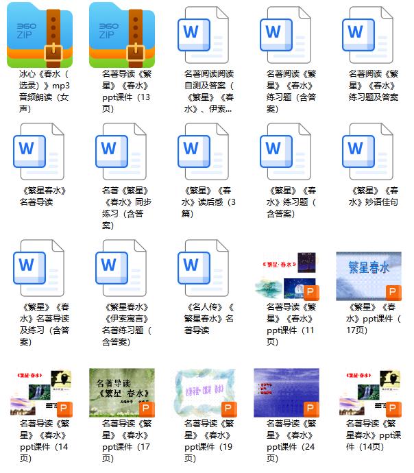 繁星春水名著导读资料集ppt课件+教案+读后感+同步练习(共22个),此资料包为转载自课件站{kjzhan},仅提供网盘下载,如介意,请不要下载。